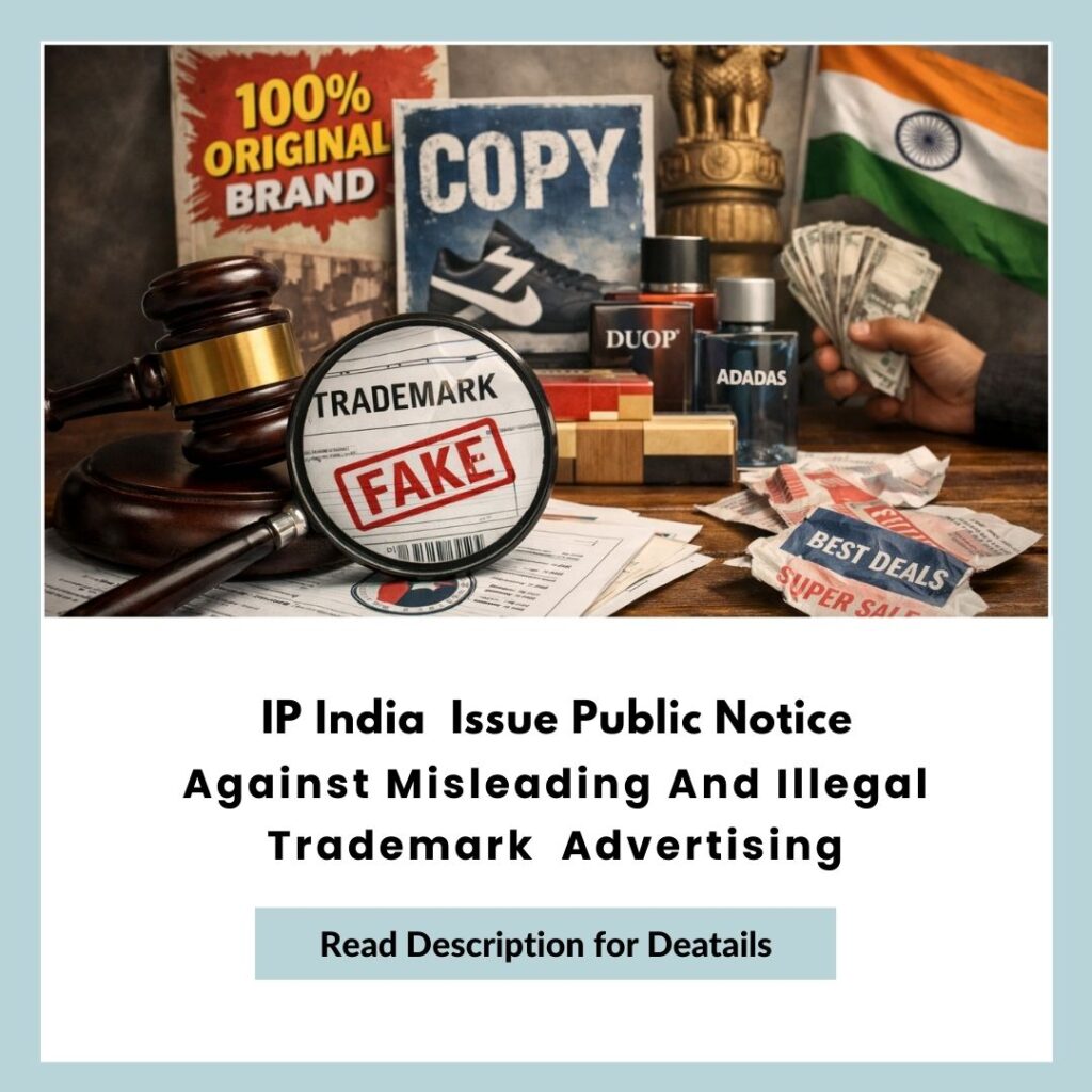 For further details, readers are encouraged to refer to the official Public Notice issued by IP India available at :https://ipindia.gov.in/uploads/7e14c707-4fb5-48c7-9748-05934c4a4a00_Public%20Notice%20Misleading%20and%20Illegal%20Advertising.pdf